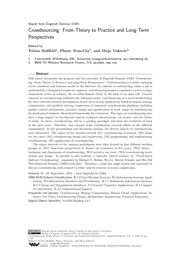 Dagstuhl Reports - Crowdsourcing: From Theory to Practice and Long-Term Perspectives (Dagstuhl Seminar 13361)