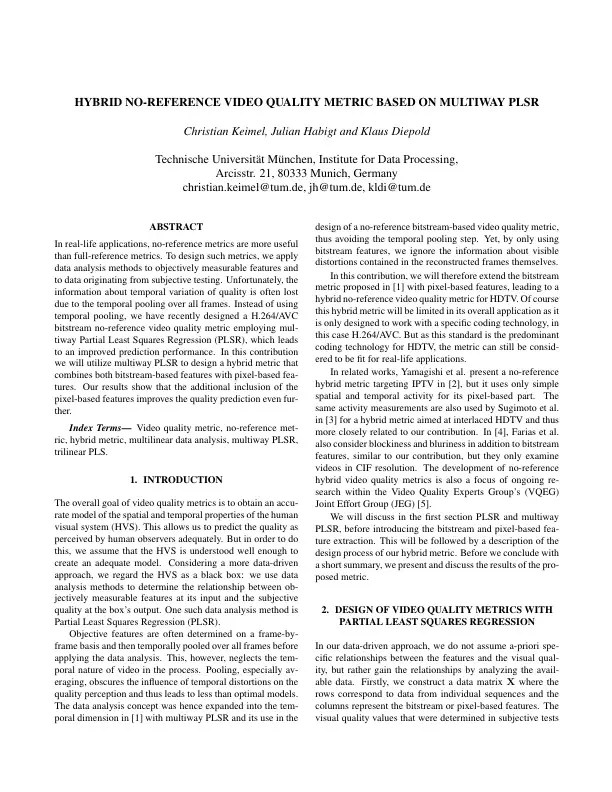 In real-life applications, no-reference metrics are more useful than full-reference metrics. To design such metrics, we apply data analysis methods to objectively measurable features and to data originating from subjective testing. Unfortunately, the information about temporal variation of quality is often lost due to the temporal pooling over all frames. Instead of using temporal pooling, we have recently designed a H.264/AVC bitstream no-reference video quality metric employing multiway Partial Least Squares Regression (PLSR), which leads to an improved prediction performance. In this contribution we will utilize multiway PLSR to design a hybrid metric that combines both bitstream-based features with pixel-based features. Our results show that the additional inclusion of the pixel-based features improves the quality prediction even further.