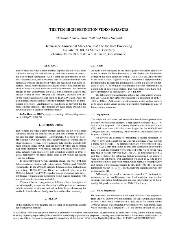 The research on video quality metrics depends on the results from subjective testing for both the design and development of metrics, but also for their verification. As it is often too cumbersome to conduct subjective tests, freely available data sets that include both mean opinion scores and the distorted videos are becoming ever more important. While many datasets are already widely available, the majority of these data sets focus on smaller resolutions. We therefore present in this contribution the TUM high definition datasets that include videos in both 1080p25 and 1080p50, encoded with different coding technologies and settings, H.264/AVC and Dirac, but also different presentation devices from reference monitors to home-cinema projectors. Additionally a soundtrack is provided for the home-cinema scenario. The datasets are made freely available for download under a creative commons license.