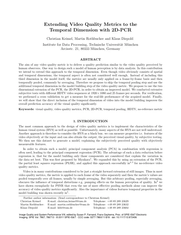 The aim of any video quality metric is to deliver a quality prediction similar to the video quality perceived by human observers. One way to design such a model of human perception is by data analysis. In this contribution we intend to extend this approach to the temporal dimension. Even though video obviously consists of spatial and temporal dimensions, the temporal aspect is often not considered well enough. Instead of including this third dimension in the model itself, the metrics are usually only applied on a frame-by-frame basis and then temporally pooled, commonly by averaging. Therefore we propose to skip the temporal pooling step and use the additional temporal dimension in the model building step of the video quality metric. We propose to use the two dimensional extension of the PCR, the 2D-PCR, in order to obtain an improved model. We conducted extensive subjective tests with different HDTV video sequences at 1920×1080 and 25 frames per seconds. For verification, we performed a cross validation to get a measure for the real-life performance of the acquired model. Finally, we will show that the direct inclusion of the temporal dimension of video into the model building improves the overall prediction accuracy of the visual quality significantly.