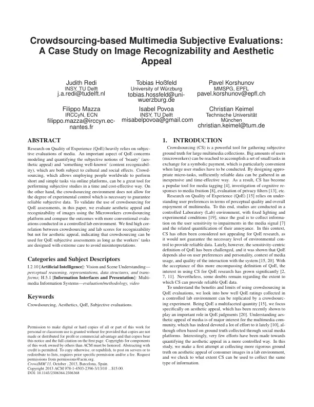 Research on Quality of Experience (QoE) heavily relies on subjective evaluations of media. An important aspect of QoE concerns modeling and quantifying the subjective notions of ‘beauty’ (aesthetic appeal) and ‘something well-known’ (content recognizability), which are both subject to cultural and social effects. Crowdsourcing, which allows employing people worldwide to perform short and simple tasks via online platforms, can be a great tool for performing subjective studies in a time and cost-effective way. On the other hand, the crowdsourcing environment does not allow for the degree of experimental control which is necessary to guarantee reliable subjective data. To validate the use of crowdsourcing for QoE assessments, in this paper, we evaluate aesthetic appeal and recognizability of images using the Microworkers crowdsourcing platform and compare the outcomes with more conventional evaluations conducted in a controlled lab environment. We find high correlation between crowdsourcing and lab scores for recognizability but not for aesthetic appeal, indicating that crowdsourcing can be used for QoE subjective assessments as long as the workers’ tasks are designed with extreme care to avoid misinterpretations.